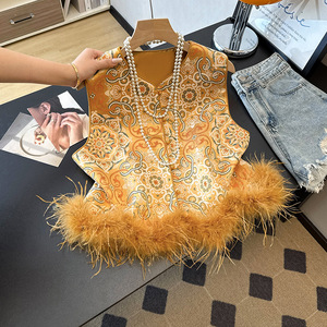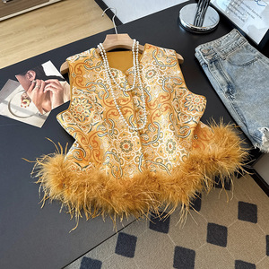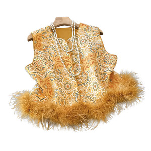 新款新中式马甲鸵鸟毛国风时尚马夹背心女外搭秋季无袖坎肩外套