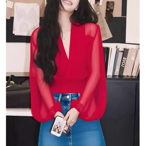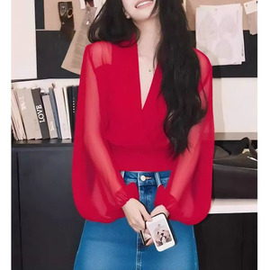 早秋du特别致超好看上衣轻奢高级感小众不撞款洋气减龄红色衬衫女