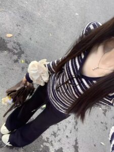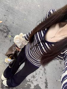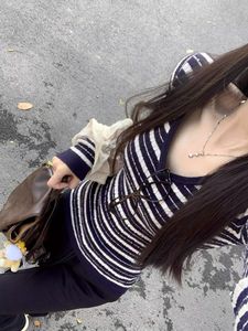 蓝白条纹V领针织衫女2025春秋新款美式复古修身显瘦短款套头上衣