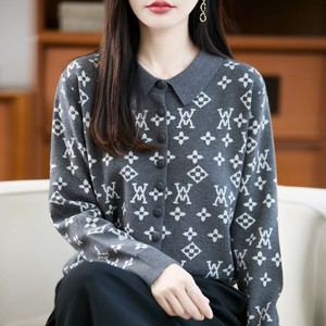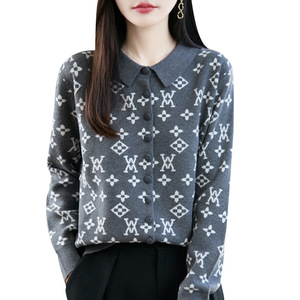 女式精纺羊毛POLO衫复古提花刺绣款长袖外套秋冬新款包扣设计外搭
