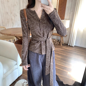 V领长袖T恤女2025早秋新款大码胖mm收腰绑带打底衫上衣