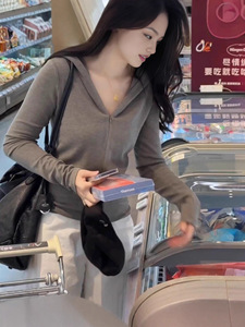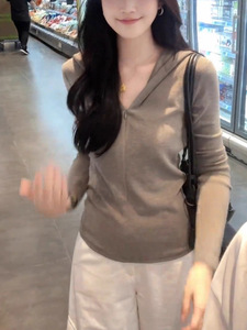灰色内搭连帽长袖T恤女巨好看的早秋高级感chic别致短款单穿上衣