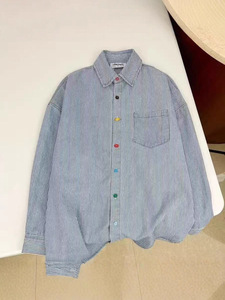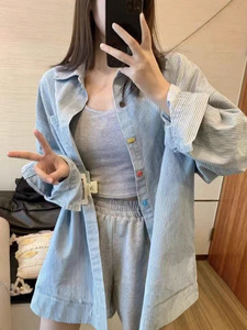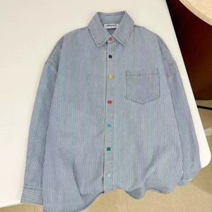 复古水洗条纹Polo领防晒衬衫女春秋季慵懒风中性港风休闲长袖上衣