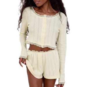 跨境秋冬新款纯棉睡衣欧美风针织提花开衫长袖短裤套装蕾丝家居服