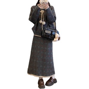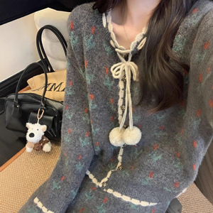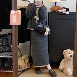 2025秋冬新款复古灰色花边系带针织开衫高腰半身裙慵懒显瘦两件套