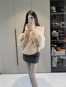 【京洛佳人】一字肩麻花套头针织毛衣拼接可拆卸狐狸毛袖口皮草女