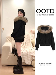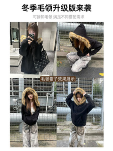黑色毛领外套宽松连帽卫衣女2025新款秋冬季美式穿搭加绒开衫上衣