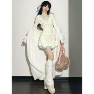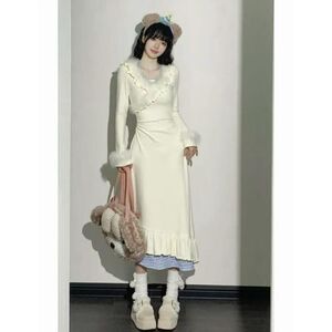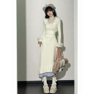 纯欲日系甜美短裙收腰显瘦设计感毛毛拼接V领假两件连衣裙女秋冬