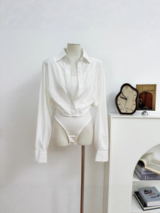 天丝连体白色衬衫女秋季法式修身收腰POLO领上衣假两件
