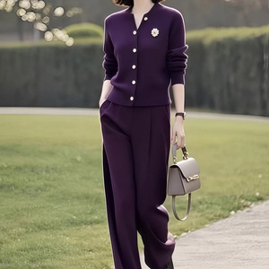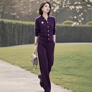 中老年妈妈套装时尚休闲新款优雅高级毛衣开衫+松紧腰裤子两件套