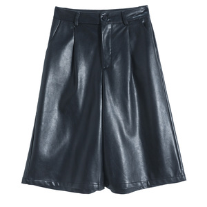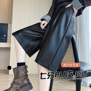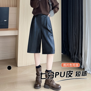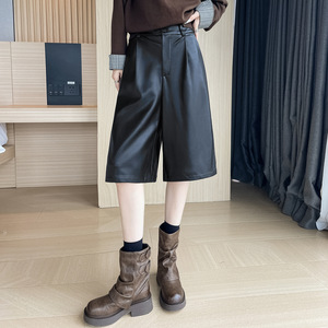 PU皮短裤女春秋2025新款高腰五分中裤宽松阔腿裤子外穿靴裤配靴子