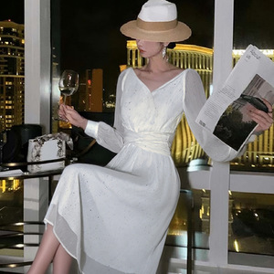 2025早秋新款高级感长袖闪闪气质法式高腰优雅V领连衣长裙可代发