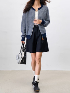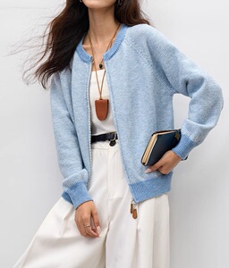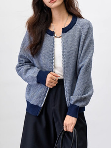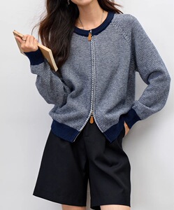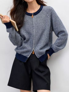 时髦撞色条纹圆领毛衣外套通勤拉链针织开衫