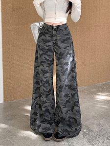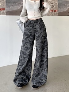 美式复古迷彩裤牛仔裤阔腿裤女秋季高腰小众宽松休闲拖地裤直筒裤