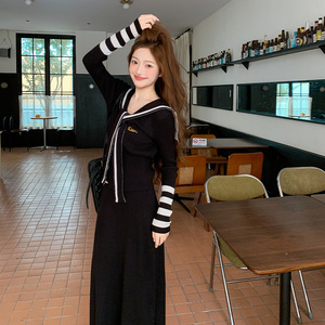 实拍黑色学院风减龄套装裙2025秋甜美条纹海军领上衣半身裙两件套