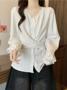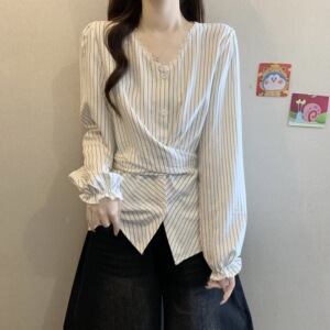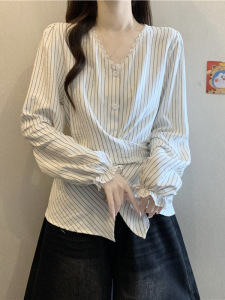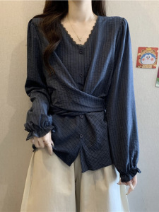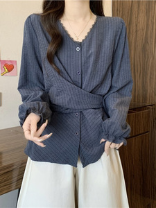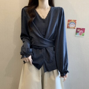 2025秋季新款女装韩系胖MM蕾丝条纹衬衫显瘦收腰长袖上衣女A7475