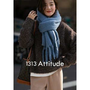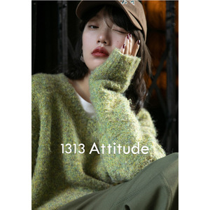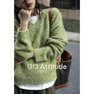 1313 慵懒复古黄绿杂花纱V领套头针织羊毛糯软宽松毛衣