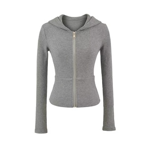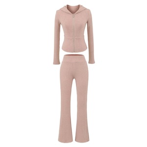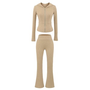 美式辣妹修身收腰长袖连帽开衫女+高腰包臀休闲微喇叭裤 两件套装