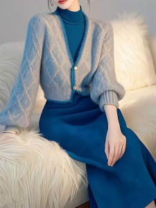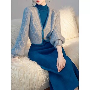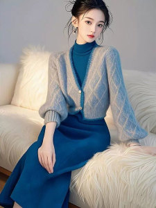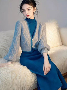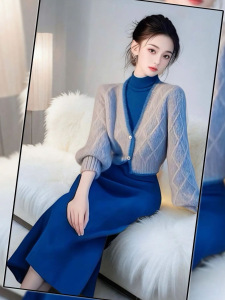 名媛气质针织裙套装女秋冬季韩系蓝色收腰显瘦v领毛衣开衫两件装
