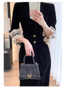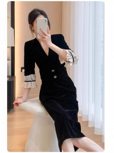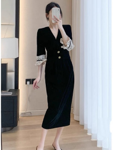 轻奢御姐风黑色贵气V领长袖连衣裙女秋季新款气质收腰礼服小黑裙