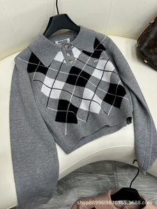 正确版mm菱格拼色套头长袖女秋冬翻领刺绣字母短款针织毛衣女