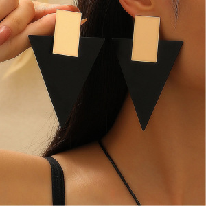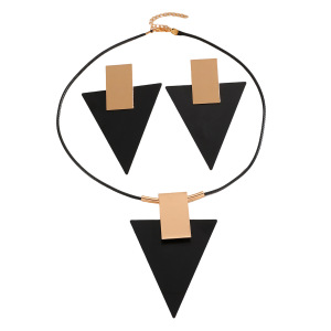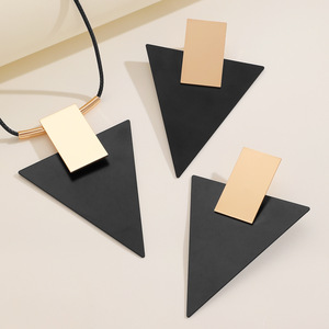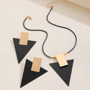 女士首饰套装几何矩形倒三角两色拼接吊坠搭配黑色绳链项链耳钉女