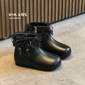2025年秋季新款儿童靴子韩版蕾丝蝴蝶结公主短靴女童花边单靴