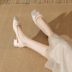 3151时尚新款米白镂空透气方头单鞋女2025粗跟小众不累脚高跟鞋