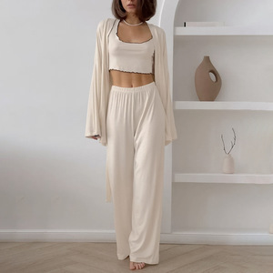 2025欧美跨境牛奶丝睡衣女秋季新款长袖内衣长裤三件套欧美家居服