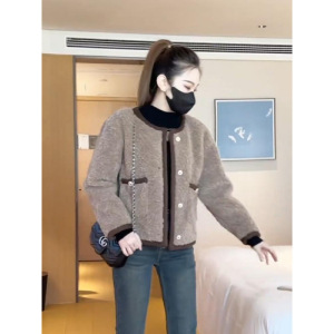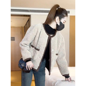 小香风羊羔毛外套女冬季加厚撞色皮毛一体羊羔绒短外套小个子上衣