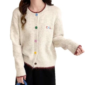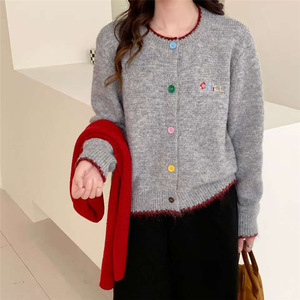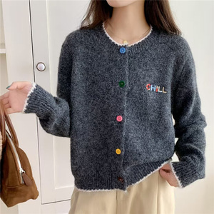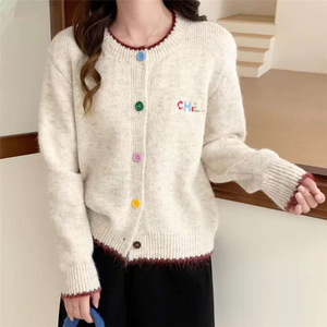 秋冬糖果色扣子毛衣开衫女字母刺绣软糯外套甜美百搭韩系复古上衣