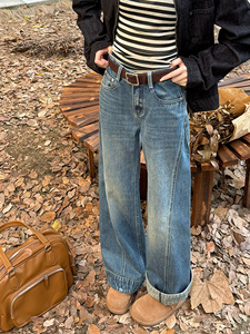 美式复古蓝高腰阔腿牛仔裤女2025秋季新款百搭修身显瘦宽松直筒裤