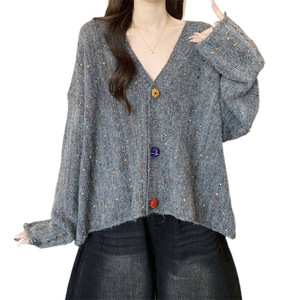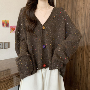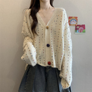 大码V领开衫彩点软糯慵懒风毛衣女2025秋冬显瘦洋气针织衫厚款