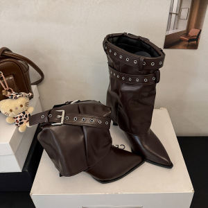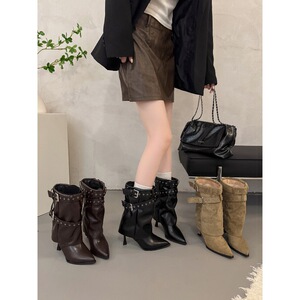 辣妹裤管短靴女2025新款细跟美拉德中筒靴气质尖头显瘦骑士马丁靴