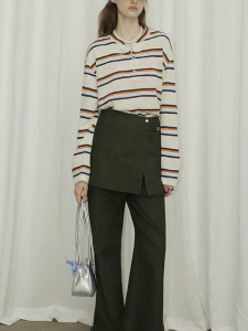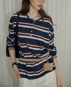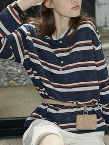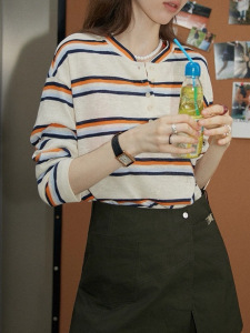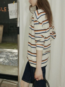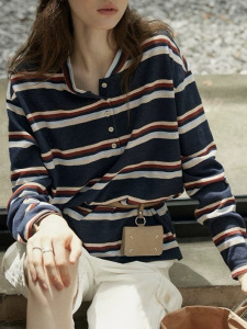 半开领撞色条纹长袖T恤女美式复古休闲慵懒初秋宽松上衣