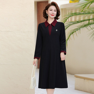 喜庆婚宴礼服秋季新款中老年女装翻领假两件裙子气质大码妈妈装