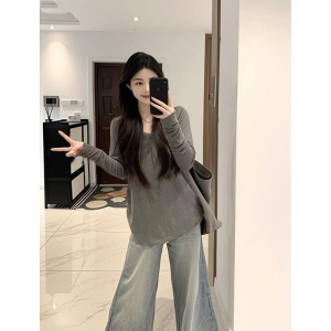 灰色v领宽松长袖t恤女2025秋季新款显瘦遮肉内搭叠穿辣妹百搭上衣