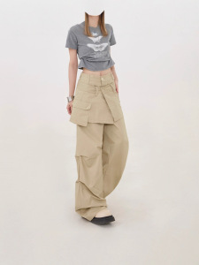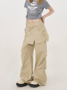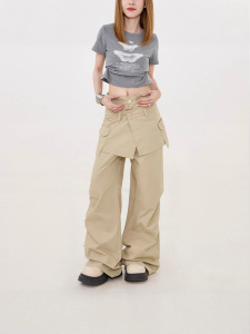 大码mm复古假两件设计可拆卸阔腿工装裤百搭新款休闲裤女长裤子