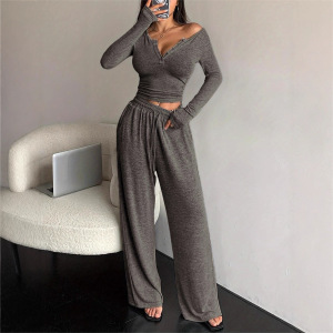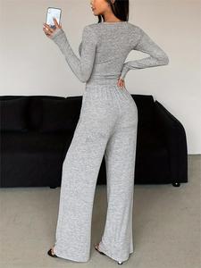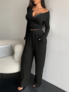 2025欧美跨境秋季新款套装长袖连扣式纯色紧身上衣加长裤两件套女