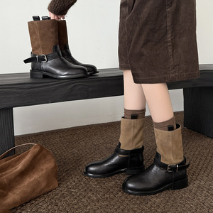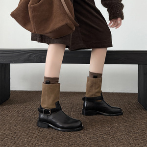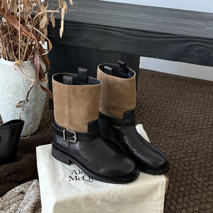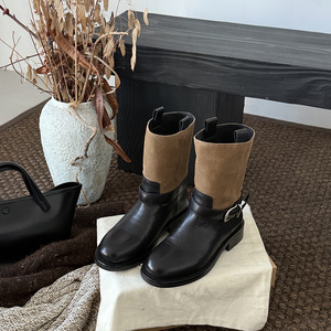 MARCO&JOYCE复古拼色皮带扣圆头粗跟中筒瘦瘦骑士靴女秋冬新款