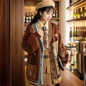 春秋新款甜美清新印花开衫毛衣女美拉德棕色V领针织外套宽松显瘦
