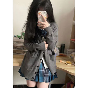 甜美学院风纯色毛衣女校供感宽松百搭纯色长袖领针织开衫套装