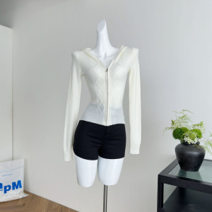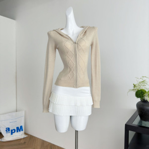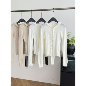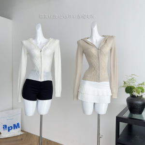 塞纳 麻花纹理拉链开衫连帽毛衣2025秋冬新款收腰羊毛上衣外套