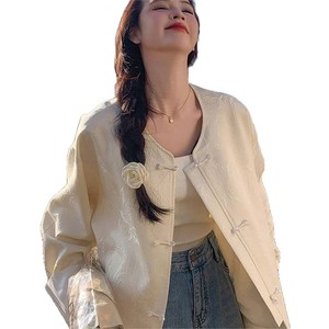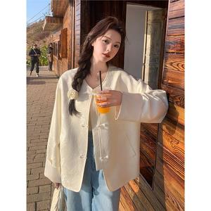新中式提花国风外套设计感女春秋季新款圆领盘扣宽松胖mm显瘦上衣