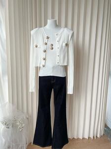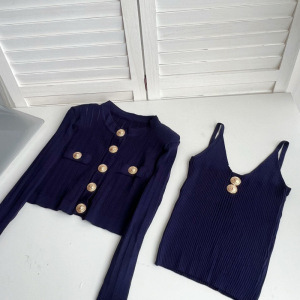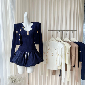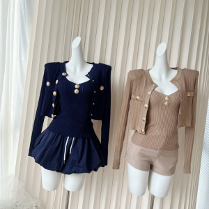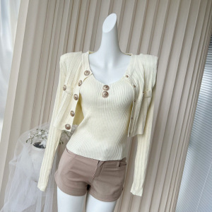 香槟色巴尔曼风针织套装女高级金属扣吊带开衫两件套