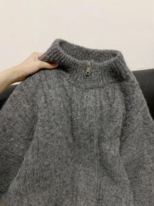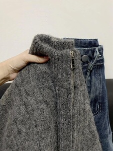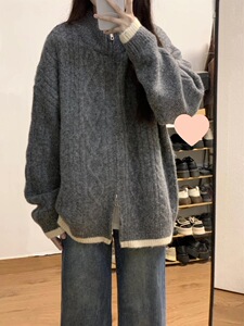 设计感灰色麻花拉链开衫毛衣女秋冬宽松慵懒风软糯加厚针织衫外套