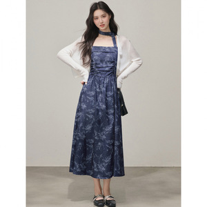 气质女装高级感褶皱收腰印花吊带连衣裙搭针织开衫外套套装两件套