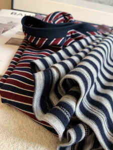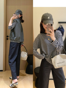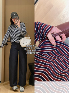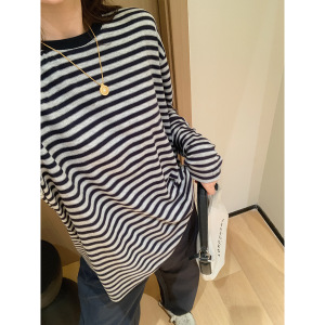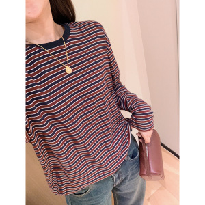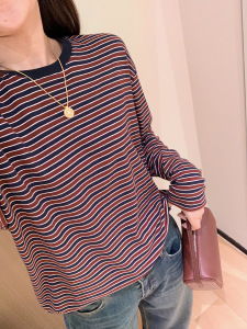 朵妮DN 定染色系T!花纱底撞色条纹宽松落肩长袖圆领内搭上衣女