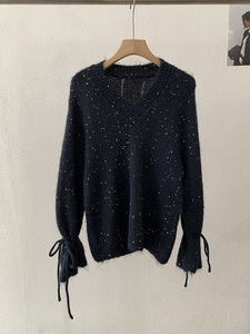 欧玛莱 彩点V领针织衫毛衣女秋季新款温柔风喇叭长袖宽松上衣4908