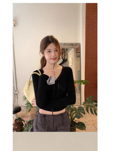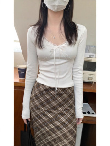 【工厂现货】螺纹德绒纯欲蕾丝V领长袖T恤女上衣甜美碎花打底衫